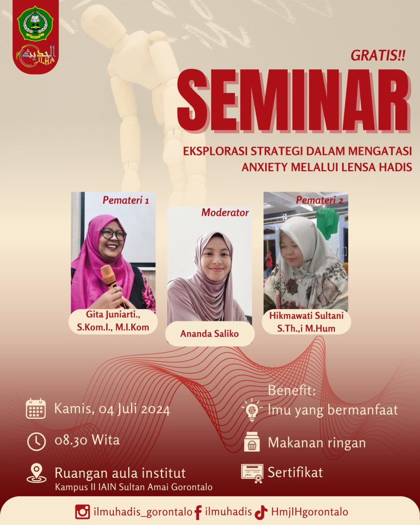Seminar yang diadakan di Aula Tarbiyah Kampus II IAIN Sultan Amai Gorontalo dibuka secara umum sehingga selain mahasiswa dari Ilmu Hadis, ini juga dihadiri oleh mahasiswa dari jurusan lain. Pembicara pertama Ibu Gita Juniarti S.Kom.I., M.I.Kom mengatakan “Kecemasan adalah bagian dari kehidupan, namun kita diajarkan untuk selalu kembali kepada Tuhan dan mencari ketenangan dalam setiap ujian yang dihadapi”. Disusul dengan Pemateri Kedua Ibu Hikmawati Sultani S.Th.I., M.Hum menimpali “Salah satu solusi yang bisa kita terapkan adalah dengan memperkuat hubungan kita dengan Allah melalu doa dan dzikir”.