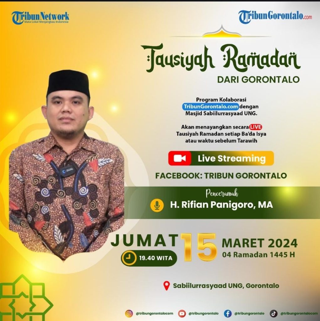 Tausiah ini diunggah oleh akun Tribun News Gorontalo, ketika menjelang waktu berbuka puasa. Narasumber dalam rekaman ini adalah mahasiswa Ilmu Hadis itu sendiri. Inisiatif kegiatan dari ketua jurusan , Muhammad Rifian Panigoro, M.A., ini, bertujuan agar mahasiswa dan masyarakat luas dapat memperdalam pemahaman agama, dengan tausiah singkat tapi mudah dicerna.