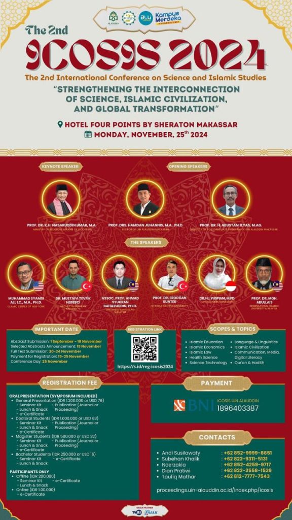 Kegiatan International Conference on Science and Islamic Studies (ICOSIS) resmi dibuka oleh Prof. Drs. Hamdan Juhannis, M.A., Ph.D., selaku Rektor UIN Alauddin Makassar pada tanggal 25 November 2024 dengan tema Interkoneksi antara Sains, Peradaban Islam, dan Transformasi Global .