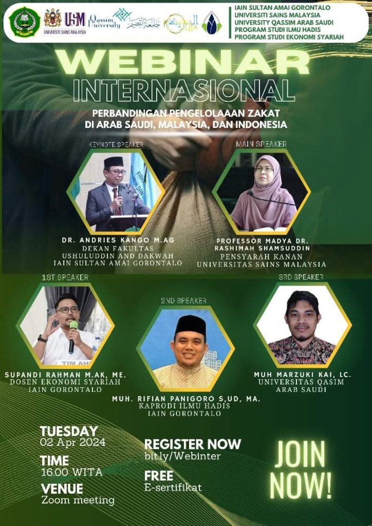 Mahasiswa Jurusan Ilmu Hadis Fakultas Ushuluddin dan Dakwah IAIN Sultan Amai Gorontalo baru saja menggelar Webinar Internasional yang sangat luar biasa, bekerja sama dengan dosen-dosen hebat dari Universitas Sains Malaysia dan Universitas Qassim, Arab Saudi. Kesempatan ini tentu menjadi momen berharga bagi mahasiswa, terutama dalam mendalami materi yang disampaikan oleh Profesor Dr. Roshimah Shamsudin dan Muh. Marzuki Kai, Lc.