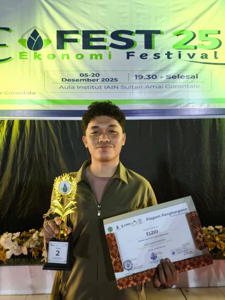 Mahasiswa Program Studi Ilmu Hadis kembali menorehkan prestasi membanggakan dalam ajang E-FEST 2025 (Ekonomi Festival) yang diselenggarakan di Aula Institut IAIN Sultan Amai Gorontalo. Kegiatan ini merupakan agenda yang diinisiasi oleh Jurusan Ekonomi Syariah sebagai wadah pengembangan minat, bakat, dan sportivitas mahasiswa lintas program studi.